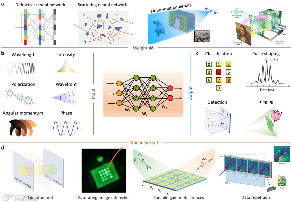 电磁神经网络。超材料模拟神经网络推理过程,在数学上构造其同素异形体,利用振幅、波长、偏振态等特征量,进行多维度信号传输和数据处理,在张量运算中优势明显,构造全连接神经网络、卷积神经网络、循环神经网络、脉冲神经网络等(图5)。