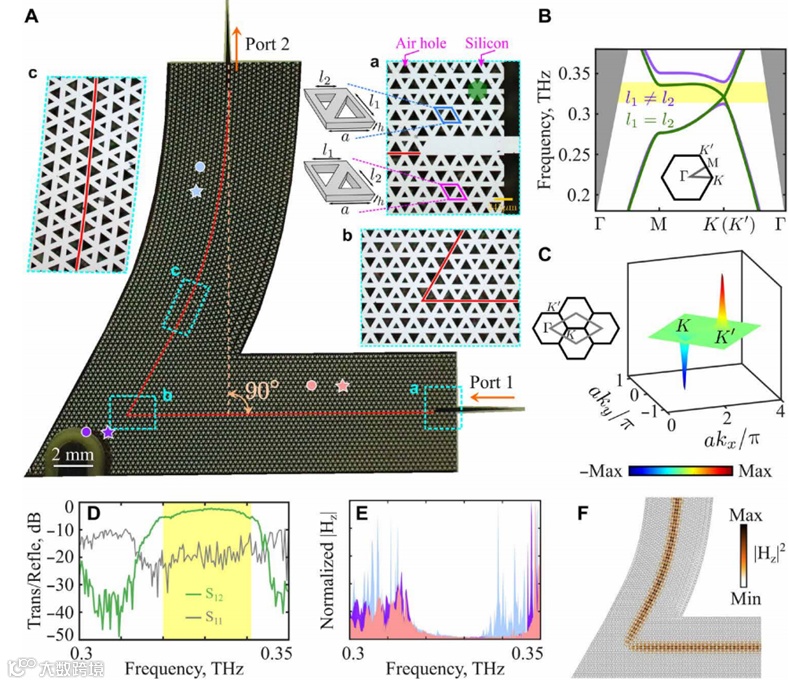 太赫兹频段在生物医学成像、安全检测及未来无线通信领域具有战略价值,尤其对6G及后6G技术发展至关重要。然而传统太赫兹器件面临体积大、损耗高、制造复杂等挑战。硅基光子晶体虽能实现低损耗传输,但受限于尖锐弯折处的严重信号衰减,制约了高密度集成芯片的发展。谷霍尔光子晶体(VPC)通过打破空间反演对称性产生拓扑边界态,在特定弯折角度下展现出近乎无损的传输特性,并已实现超高速数据通信。但既有的VPC设计受晶格受到对称性约束,波导路径仅能沿固定轴向延伸并限定弯折角度,无法满足多功能芯片的自由布局需求。