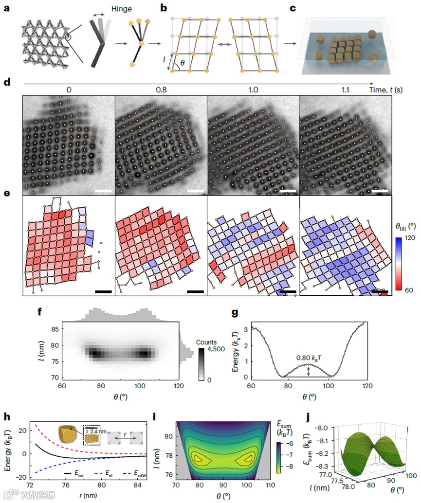 近日,伊利诺伊大学Qian Chen、密歇根大学Xiaoming Mao、威斯康星大学麦迪逊分校Wenxiao Pan团队,将拓扑设计的机械框架与胶体纳米粒子(NP)组装晶格相结合,提出了NP组装晶格(如麦克斯韦晶格与六边形晶格)中声子能带结构的理论与实验框架。采用各向异性的金纳米立方体构建具完美铰链特性的麦克斯韦晶格,限制粒子纵向运动并允许旋转自由度。利用液相透射电子显微镜构建的声子模式纳米显微镜(PMN)平台,无需预设相互作用模型即可测量声子能带结构,并识别晶格中的软模式与各向异性传播特性。相比之下,六边形晶格不含软模式,展现各向同性行为并抑制重构。结合PMN与粗粒度计算,揭示了晶格结构与NP间多体、熵效应及远程相互作用对声子结构的调控机制。该研究为纳米尺度声子传播与NP基机械超材料的开发提供了理论与实验基础。相关工作发表在《Nature Materials》上。(刘帅)