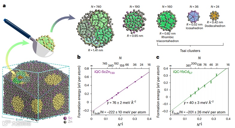 近日,美国密歇根大学的孙文豪教授团队创新性地开发了纳米颗粒尺寸标度技术,首次实现了准晶体相形成能与表面能的直接第一性原理计算。该方法通过构建不同尺寸的二十面体准晶纳米颗粒,结合高精度有限元密度泛函理论计算,系统研究了ScZn7.33与YbCd5.7两种典型二元准晶。计算结果表明,这两种准晶的体相形成能均显著低于其相应合金体系的凸包线,确证它们为零温热力学稳定的基态相。这一发现颠覆了“平移对称性是固体零温稳定性必要条件”的传统认知,对理解固体中原子结构与化学键的本质关系提出了深刻问题。尽管ScZn7.33被证实为热力学稳定相,研究进一步发现其凝固过程受动力学制约:具有较低表面能的ScZn6相在多数成分条件下优先成核。通过构建混合热力学-动力学相图,该研究揭示仅在高锌成分与特定过冷度条件下,准晶相才具备成核优势,这合理解释了其合成困难性与实验观测现象。此项工作不仅解决了准晶稳定性这一长期争议,其发展的非周期材料能量计算方法为研究玻璃、非晶氧化物等复杂体系的构效关系开辟了新途径,该研究成果发表于《Nature Physics》。(刘梦洋)