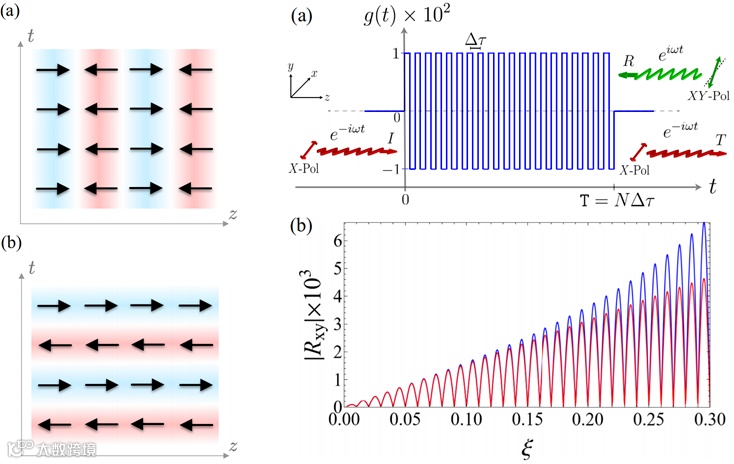 时间调制介质的光学研究可以追溯至上世纪50至70年代的开创性工作。近年来,伴随材料工程与纳米制造技术的迅猛发展,研究者对该领域的兴趣持续升温,也使得时间调制光学结构的实验实现变得切实可行。通过在时间维度上调控材料参数,系统可展现出一系列非常规现象。由于系统不再具备时间平移对称性,能量守恒在一般不再成立,这为实现辐射的选择性放大、频率转换,甚至静止电荷辐射等现象提供了可能。此外,时间调制还可在无静态磁场的条件下,在光学频率范围内打破时间反演对称性,为构建强非互易光学结构提供新的平台。从物理图像上看,时变介质与光子晶体在概念上存在对应关系。空间周期性结构赋予光子晶体以动量空间中的能带结构,而时间调制则使系统在频率域产生非平凡结构。典型实例是光子时间晶体,其具有动量带隙、可支持时间反射等独特现象。需要指出的是,光子时间晶体与“真正的”时间晶体不同,后者的时间对称性是自发破缺而非外部驱动。尽管时间调制常常伴随时间反演对称性破缺和非互易性,但其可实现的非互易响应形式仍远未被完全探索。其中,轴子电动力学近年来在基础物理、凝聚态物理以及光学领域均受到广泛关注,成为研究焦点。已有研究表明,在空间磁化非均匀(如反铁磁结构)中可以诱导有效轴子场。这些系统中的基本激发,例如自旋波或磁振子,使得轴子响应具有显著的时间依赖性。