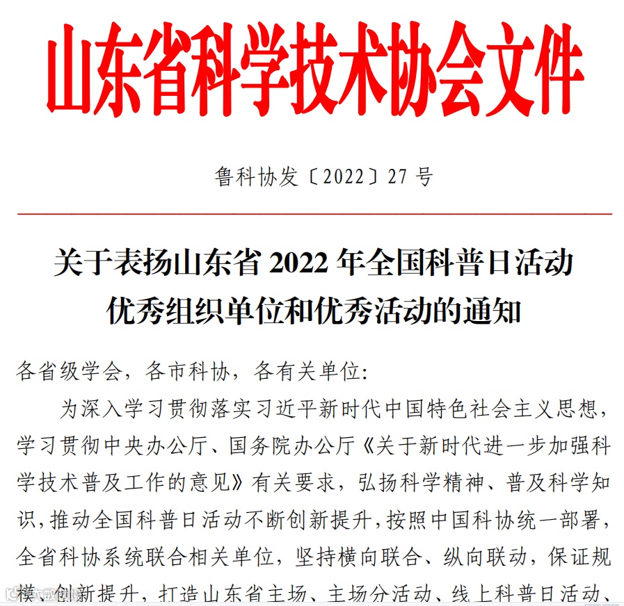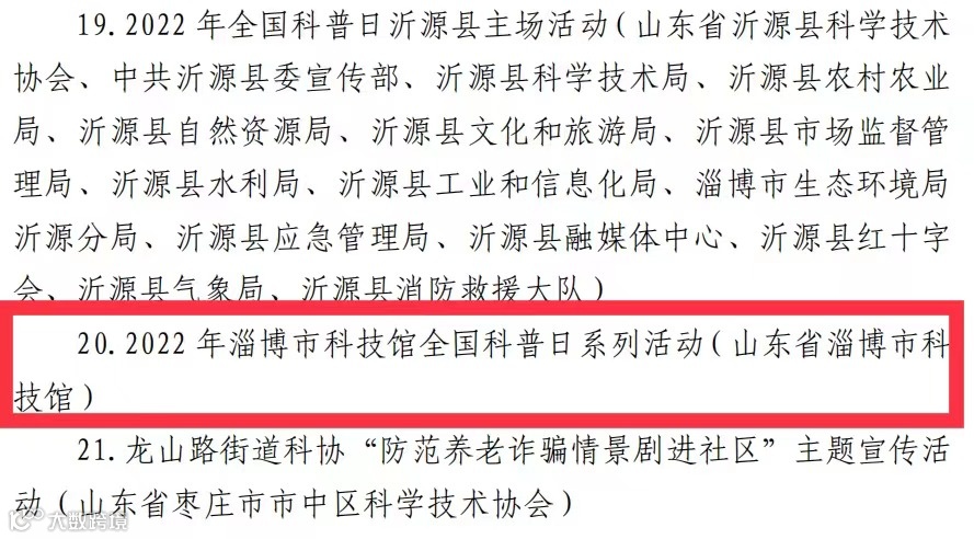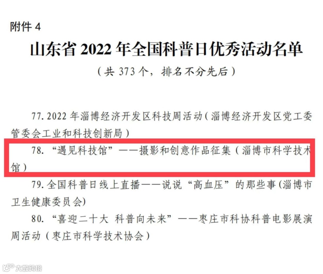 日前,中国科协办公厅印发《关于对2022年全国科普日有关组织单位和活动予以表扬的通知》,淄博市科技馆举办的“2022年淄博市科技馆全国科普日系列活动”被评为2022年全国科普日优秀活动。“遇见科技馆——摄影和创意作品征集”被评为山东省2022年全国科普日优秀活动。