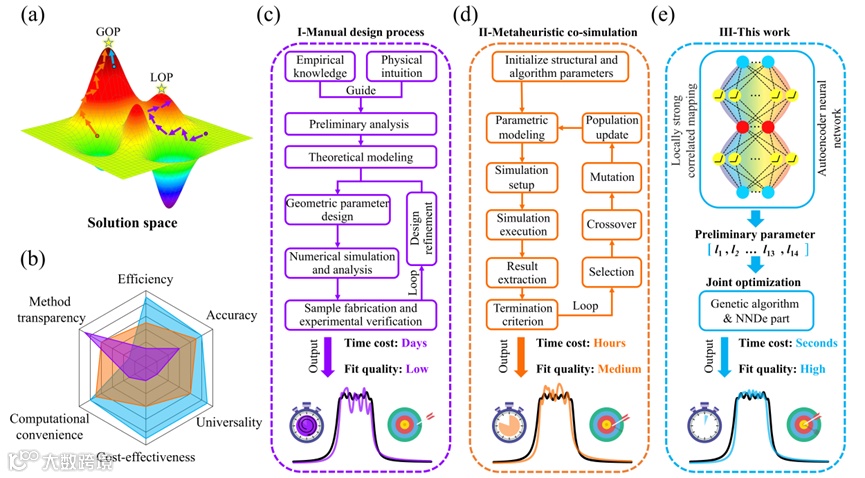 西安交通大学机械工程学院马富银教授课题组提出了一种基于元启发增强的自动编码器神经网络,能够实现吸声超结构宽频范围内的高度定制化设计及优化。矩阵运算方法的引入显著缩短了数据集的生成时间。通过对自动编码器神经网络结构的精心设计,对数据集结构参数的序列化处理,分阶段训练方法及异构损失函数的使用等一系列优化方法,克服了逆向设计的多解性难题,使得神经网络能够更好地收敛。此外,将元启发式算法与自动编码器神经网络相结合,充分发挥解码器部分的功能,实现了对初步设计结构参数的进一步优化。通过上述方法,基于普通性能的PC,数据集生成和目标曲线的建立可以在10秒内完成。整体训练过程耗时约23小时,需使用支持CUDA运算的独立显卡。最终,在500-1500Hz的区间内,成功设计了能够实现近500Hz频宽宽带吸声效果和具有多频段异效吸声能力的声学超结构。结构厚度仅23mm,小于最大目标波长的1/29。通过数值模拟和实验对该方法的有效性和准确性进行了双重验证。其与传统超结构设计方法的对比如图 1所示。该方法具有低成本,高效率,通用性强的特点,有望加速声学超结构的研究与应用进程,突破其定制化设计瓶颈,拓展实际应用场景。