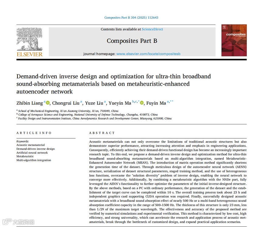 相关研究成果以“基于元启发增强自动编码器神经网络的超薄宽带吸声超结构的按需逆向设计与优化”(Demand-driven inverse design and optimization for ultra-thin broadband sound-absorbing metamaterials based on metaheuristic-enhanced autoencoder network)为题,在线发表在《Composites Part B: Engineering》[2025,304,112643]上。西安交通大学为第一作者单位,西安交通大学和国防科技大学为通讯单位,机械工程学院硕士生梁智斌为第一作者,马富银教授和麻越垠博士为共同通讯作者,机械工程学院副研究员刘崇锐和博士生刘宇泽对论文提供了重要贡献。