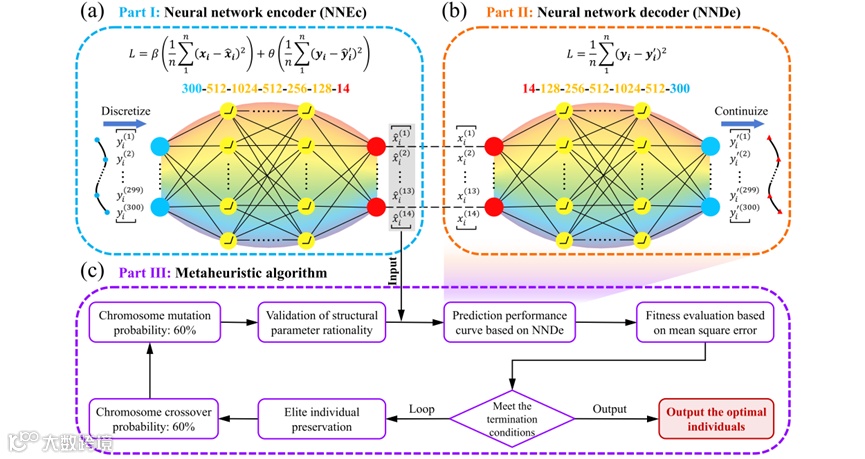 论文的最终目的是根据目标吸声系数曲线实现对结构参数的按需设计及优化,属于机器学习任务中典型的多输入多输出的非线性回归类问题。为了避免多解性导致的难收敛问题,选择了基于AENN来进行结构参数的按需逆向设计。所采用的AENN结构如图 3所示,主要由编码器(Neural Network Encoder,NNEc)和解码器(Neural Network Decoder,NNDe)两部分组成,中间由瓶颈层将两者进行串联。基于分阶段训练方法,首先训练NNDe,将每组数据的14个结构参数和与之对应的吸声系数曲线离散序列值作为输入和理想输出进行训练。在NNDe能根据结构参数快速准确地预测吸声系数曲线后,即可视为完成训练。随后将NNEc与NNDe部分进行串联构成完整的AENN。接下来锁定NNDe的权值和偏差单独对NNEc进行训练,两部分的训练过程基于不同的损失函数进行。通过上述方法,利用训练完成的NNEc对目标曲线进行结构参数设计,得到的结果已经基本能够实现既定需求。在此基础上将元启发式算法与NNDe部分相结合,能够实现对初步设计结构参数的进一步优化,同时充分发挥了AENN的整体性能。