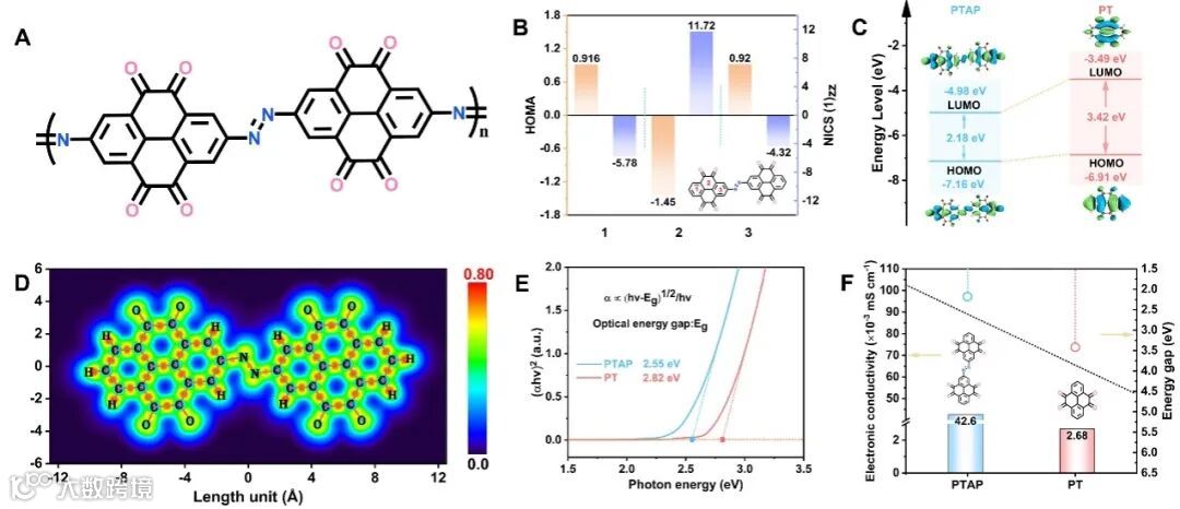 图1. PTAP分子的结构特征。(A) PTAP的分子结构;(B) 计算出的HOMA和NICS(1)ZZ数值;(C) 计算HOMO/LUMO相对能级和能隙;(D) LOL-π彩色填充图;(E) PTAP和PT的光学能隙;(F) PTAP和PT的电子电导率及对应的能隙。