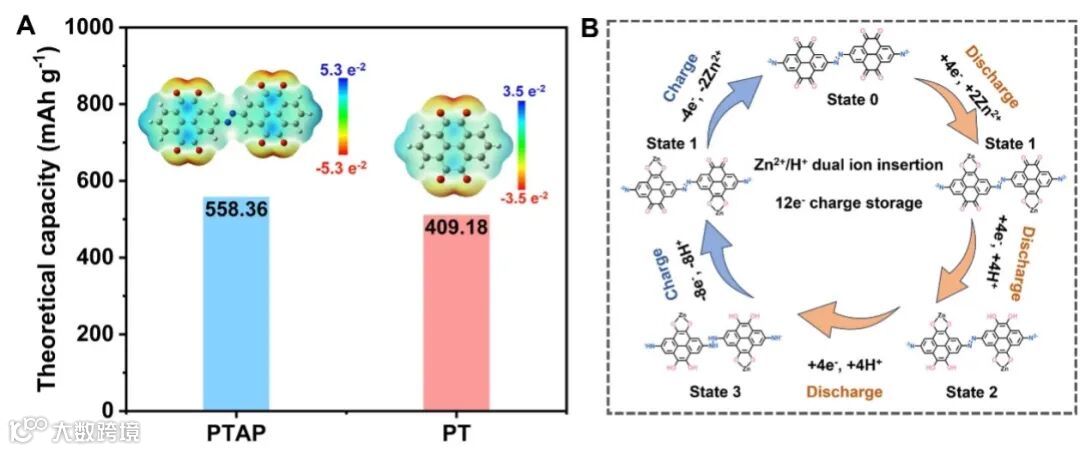 图2. (A) 分子的理论比容量及相应的ESP模拟结果;(B) PTAP阴极的氧化还原转化过程。