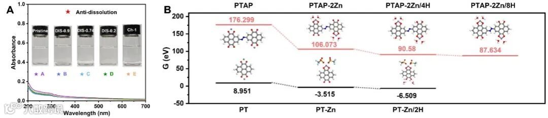 图3. (A) PTAP电极浸泡在Zn(OTf)2电解液中一个月后的紫外可见光谱,附图为相应的光学照片。(B) PTAP和PT电极在Zn(OTf)2电解液中的溶剂化自由能。