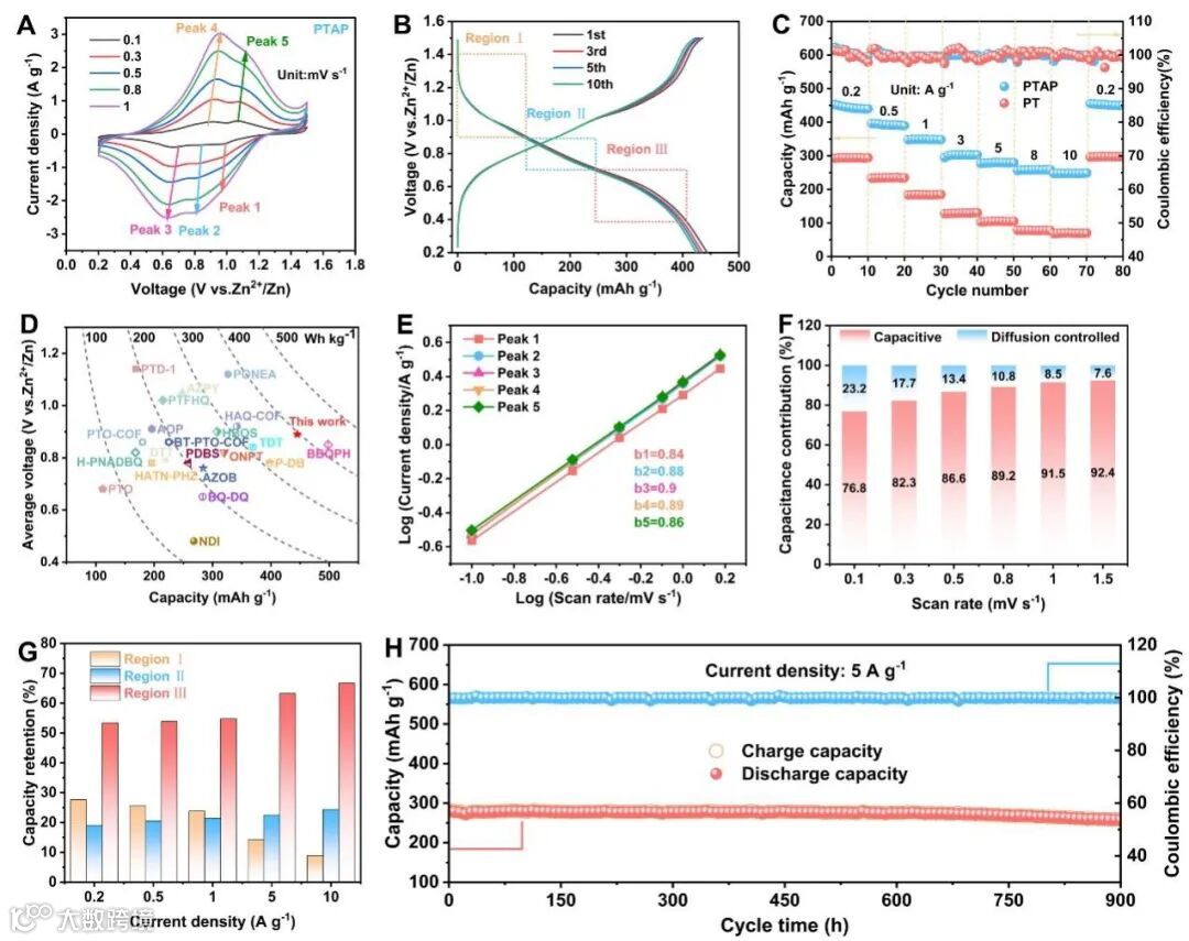 图4. (A) PTAP和PT阴极ZOBs的CV曲线;(B) 不同循环下的恒流充放电曲线;(C) 不同电流密度下的容量和库仑效率;(D) PTAP电极和报道的有机阴极的容量和能量密度对比;(E) 峰值电流密度与扫描速率的线性拟合;(F) 电容式和扩散控制式电荷存储的相对贡献;(G) 不同电流密度下区域I、II和Ⅲ的容量保持率;(H) PTAP阴极在5 A·g-1下的循环稳定性。