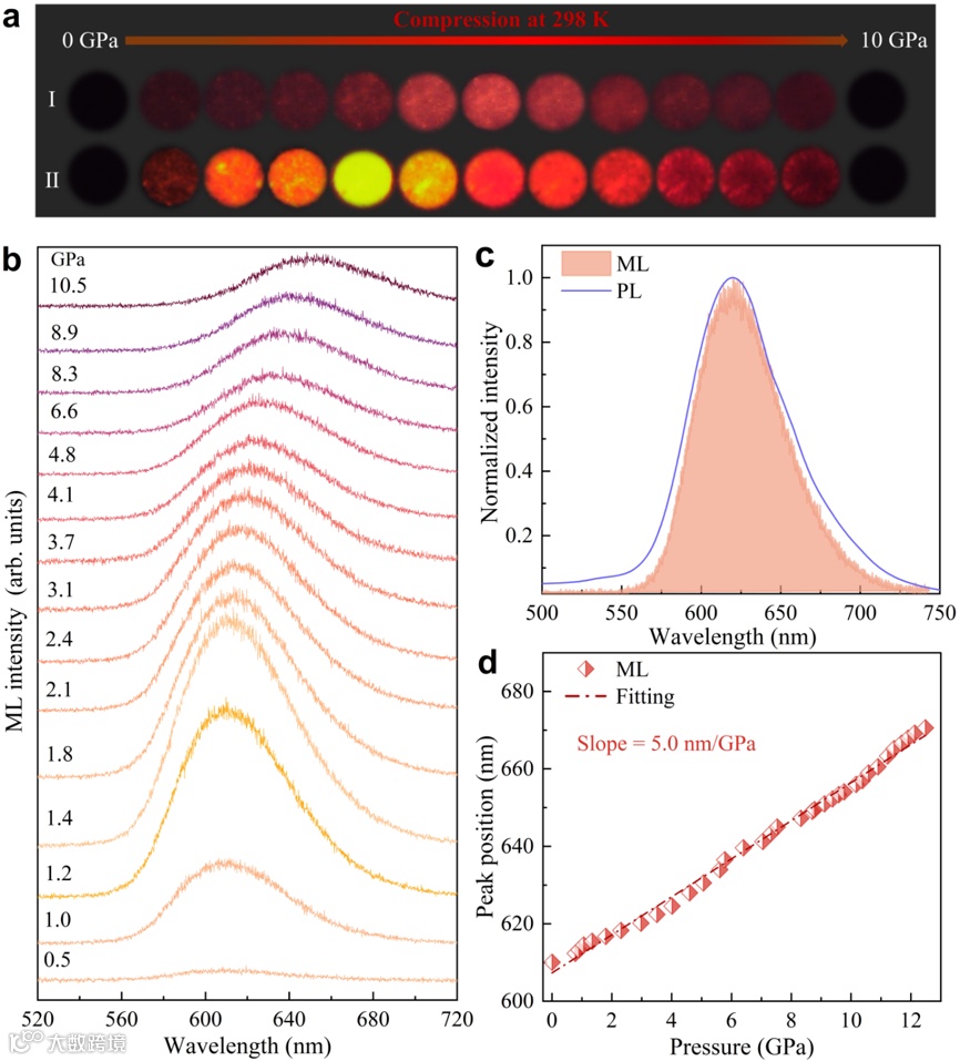 图 1:在快速加载过程中SrZnOS: Mn2+的力致发光行为。(a)在室温时以 0.6 GPa/s(I)和6.5 GPa/s(II)的速率进行压缩时的自恢复型力致发光光学照片。(b)在4.7 GPa/s时的力致发光光谱。(c)压力为~1.0 GPa 时的力致发光和荧光光谱。(d)力致发光光谱的峰位对压力的依赖关系。