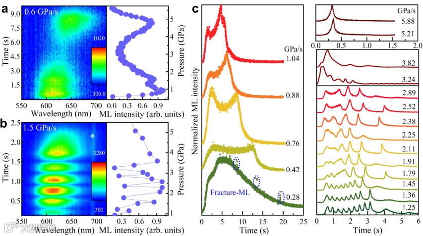 图2:不同压缩速率下SrZnOS: Mn2+的振荡力致发光行为。在以0.6 GPa/s(a)和1.5 GPa/s(b)连续加载时,力致发光光谱随压力(或时间)的变化关系。(c)以不同压缩速率进行快速压缩时瞬时力致发光强度随时间的变化关系。