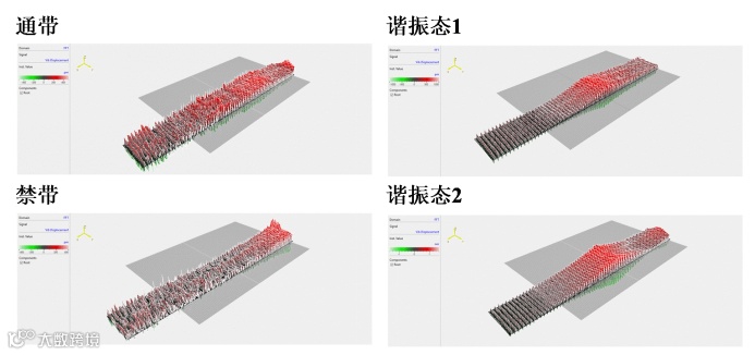 图3 声表面波的面外位移场分布图,频率分别对应第一能带,带隙,及ξ = 0.3和0.7时腔体共振频率。