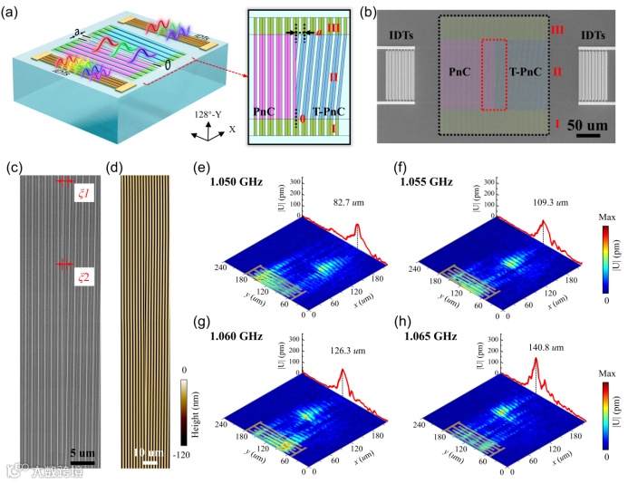 该拓扑效应可用于设计两类高效的拓扑声表面波器件:一类是彩虹类单频声表面波滤波器,其具有广泛可调的工作频率范围。图2展示了一个单个声表面波声子晶体器件,其中引入了平移参数ξ。图中显示了平移参数应用于左侧区域,将结构划分为T-PnC和PnC两部分。图2b、2c和2d分别为该结构的放大SEM图、AFM图像和横截面SEM图像,均表明该结构具有良好的均匀性和平滑表面。实验中,利用图2a中的一对叉指换能器进行传输谱的测量,图2e总结了不同ξ值下的传输谱,实验结果验证了在禁带内存在无间隙的拓扑边界态。图2f展示了ξ = 0.7时的传输谱,其在1.0636 GHz处出现一个高品质因子(Q = 1687)的共振峰,且拓扑边界态在不同平移量下仍保持良好的共振特性。
