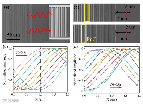 图5 (a) 用于测试反射相位的实验样品的SEM图像。(b) 声子晶体的SEM图像,ξ = 0(上图)和ξ = 0.40(下图),用于测量反射相位。(c) 在1.05 GHz(带隙内)时模拟的归一化反射位移场。(d) 在1.05 GHz(带隙内)时实验测得的归一化反射位移场。