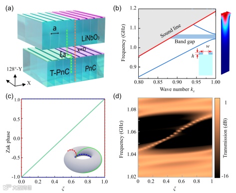 图1 (a) 一维声子晶体具有完整的周期(上图)和具有ξa的空间平移(下图)。(b) 一维声子晶体的声表面波带结构,其中阴影区域为带隙。(c) 随参数ξ变化的Zak相位演化。(d) 从ξ = 0到ξ = 1的边界下,一维声子晶体的传输谱。