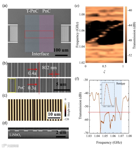 图2 (a) 具有空间边界的声子晶体的SEM图像。(b) 具有不同ξ值的声子晶体的放大SEM图像。(c) ξ = 0.3时的声子晶体原子力显微镜图。(d) 结构的横截面SEM图像。(e) 实验测得的从ξ = 0到ξ = 1的空间边界下,一维声子晶体的传输谱。