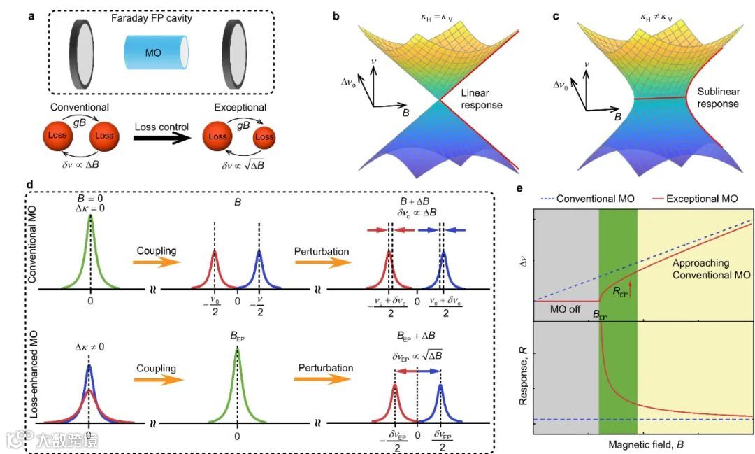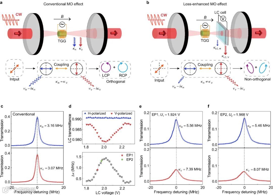 近日,南京大学夏可宇教授、陆延青教授团队与湖南师范大学景辉教授、中国科学院物理研究所刘伍明研究员及新加坡国立大学仇成伟教授团队合作,提出并实验实现了一种非厄米磁场传感技术。通过在由两个光学凹面镜构成的光学腔内插入磁光材料和液晶“软光子”材料,团队构筑了一种只有耗散没有增益的非厄米磁光系统,成功演示了非厄米磁光效应,实验证实了非厄米传感原理相对厄米传感技术在响应和测量灵敏度方面的巨大优越性。