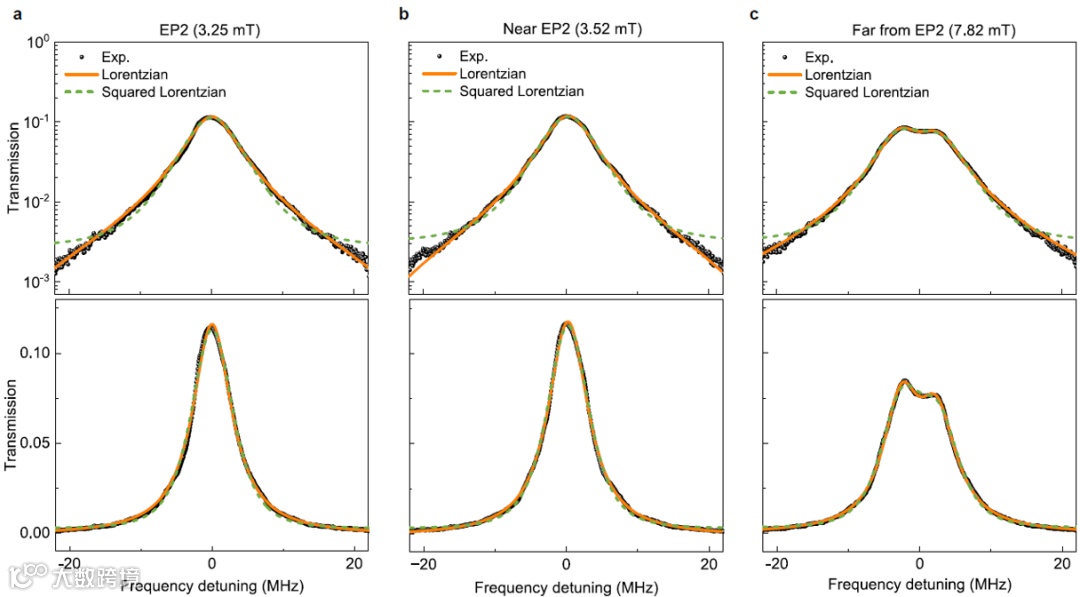 图3:显示了EP2传感器在EP (a)接近EP (b)和远离EP (c)时的总传输光谱(上排为对数尺度,下排为线性尺度)