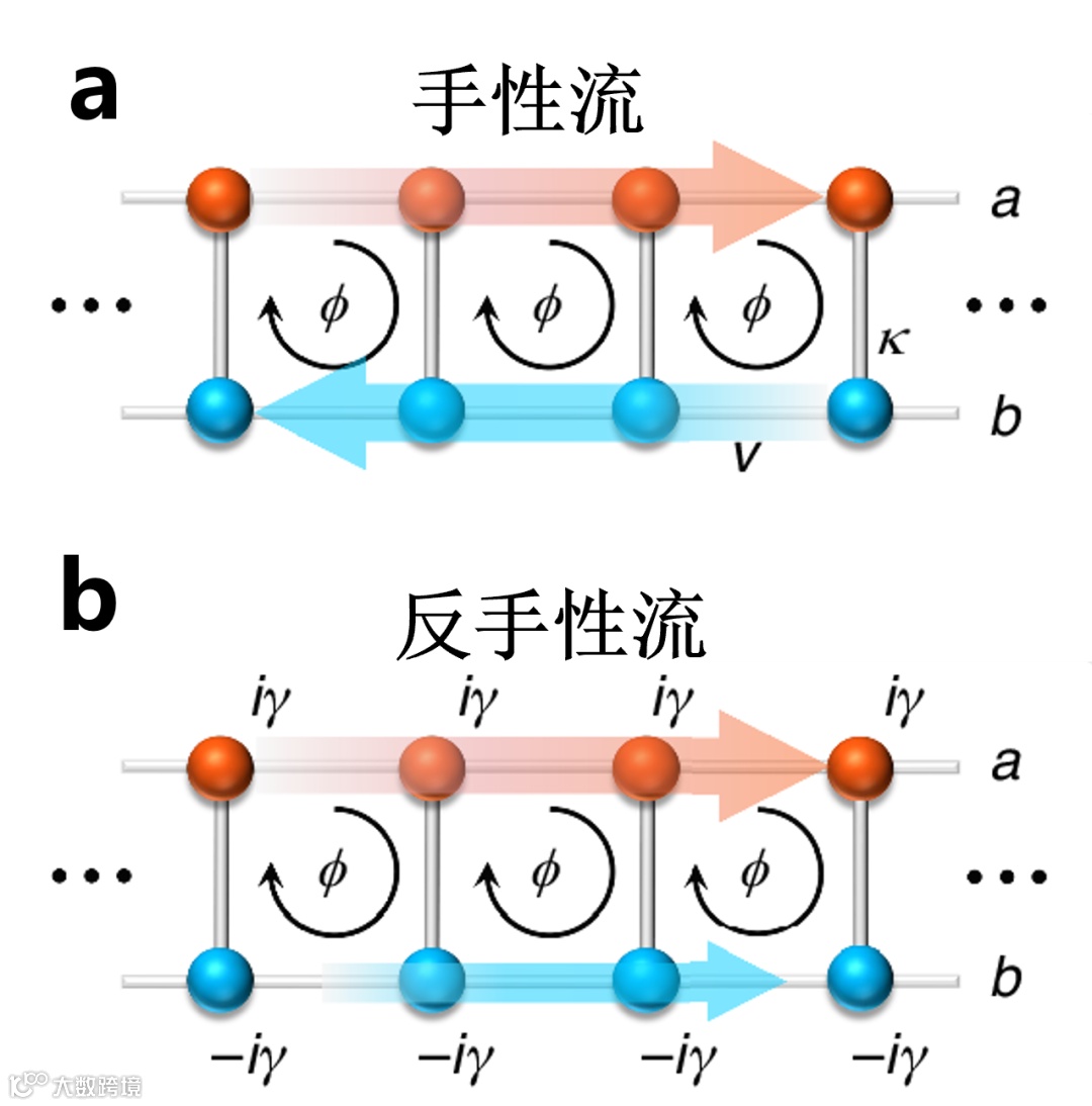 图1. (a) 具有等效磁场的梯子型霍尔晶格中的手性流;(b) 增益损耗诱导的梯子型霍尔晶格中的反手性流。