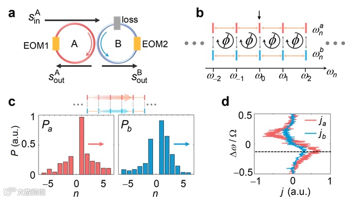 为晶格提供等效的磁场。同时,在B环上加入额外的损耗器件,使合成霍尔晶格的两条链产生损耗差,损耗较小的a链具有等效的增益,而损耗较大的b链则具有等效的损耗,从而在合成频率空间中构建了一个具有等效增益和损耗的非厄米梯子型霍尔晶格,如图2b所示。实验上通过激发a链来测量两条链上的稳态模式分布,进而得到两条链上的边缘流的大小。实验测得的某一个频率处的稳态模式分布如图2c所示。从图中可以看到,两条链上的边缘流传输方向相同,即证明了该系统中反手性流的存在。整个能带范围对应的边缘流如图2d所示。