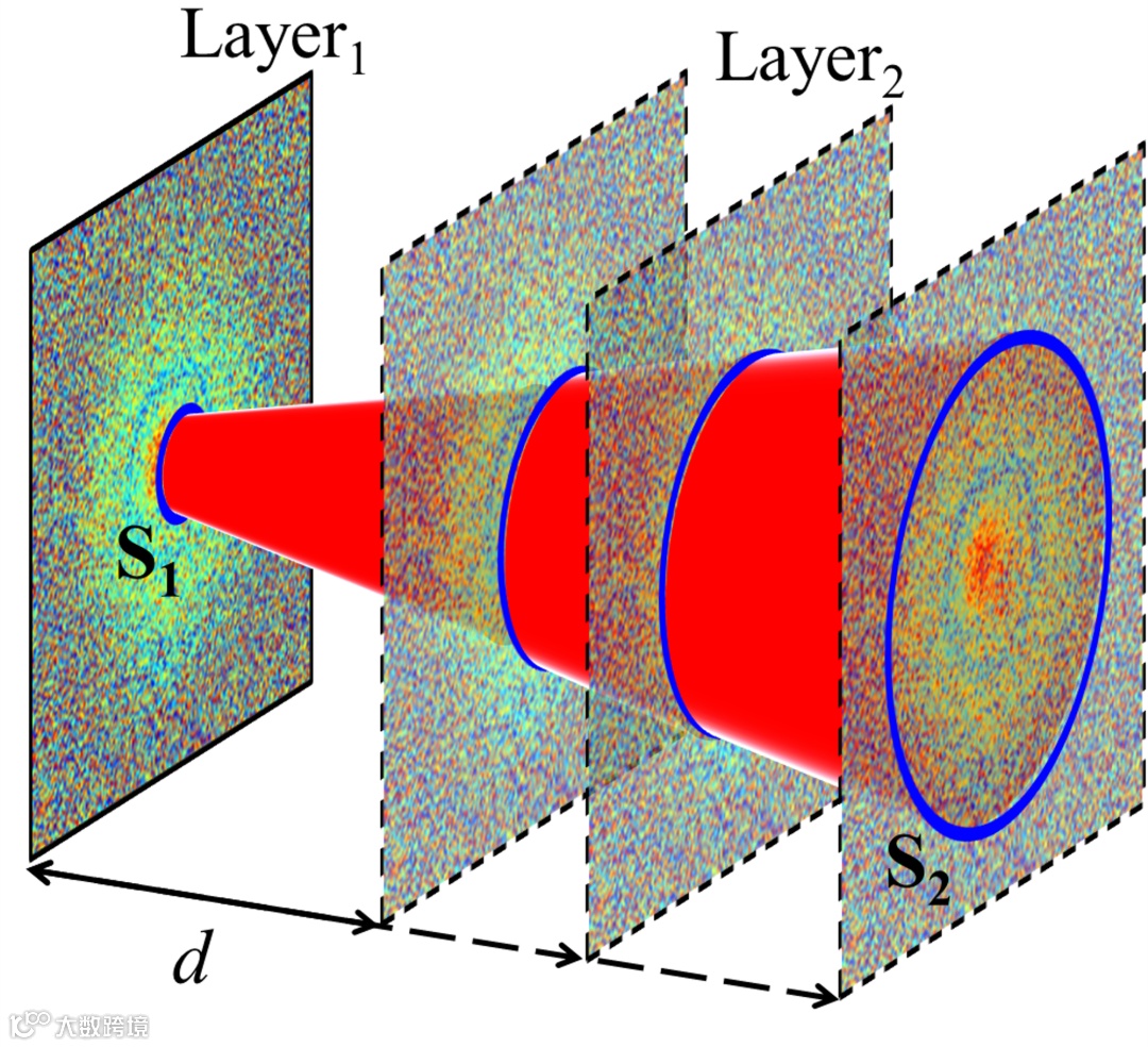 在研究和实现PC-DONN的过程中,优化网络性能的策略至关重要。为了提高系统的识别精度和计算效率,研究团队主要采用了两种优化策略:增加随机屏数量和调整层间距。随机屏是调制光场相位的关键元素,通过引入随机分布的相位变化,它能够模拟具有不同相干长度的部分相干光场。当随机屏数M较小时,会导致模拟光场与真实的部分相干光场存在误差,这一误差会影响网络的收敛,从而引发欠拟合问题。研究结果表明,随着随机屏数量的增加,PC-DONN的识别准确率显著提高,尤其在低相干光源条件下表现尤为突出。然而,需要注意的是,M的增加意味着更高的算力需求,本文强调需要在优化计算资源与准确率之间找到平衡点。此外,层间距是PC-DONN中的另一个关键参数。研究团队发现缩小相邻层之间的距离可以更有效的提升准确率,因为距离增加会导致相邻层形成更多的连接(如图2),覆盖了更大范围的光场区域,从而降低了整体相干性,进而导致欠拟合。实验结果表明,较短的层间距能够更高效地维持网络的训练效果,从而提高整体识别精度。具体来说,在l = 0.05 mm条件下训练的PC-DONN展现出89%的准确率。此外,通过进一步优化随机屏数量和层间距离,对于测试光源的相干长度从0到0.01 mm,准确率可进一步提高至90%。