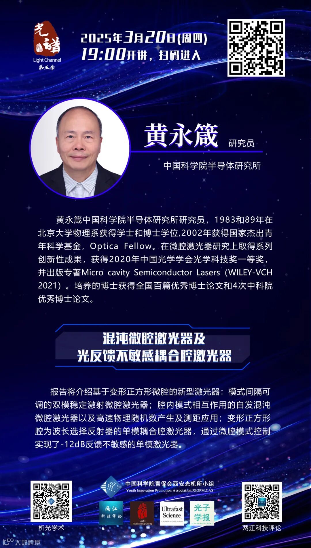 黄永箴,中国科学院半导体研究所研究员,1983和89年在北京大学物理系获得学士和博士学位,2002年获得国家杰出青年科学基金,Optica Fellow。在微腔激光器研究上取得系列创新性成果,获得2020年中国光学学会光学科技奖一等奖,并出版专著Micro cavity Semiconductor Lasers(WILEY-VCH 2021)。培养的博士获得全国百篇优秀博士论文和4次中科院优秀博士论文。