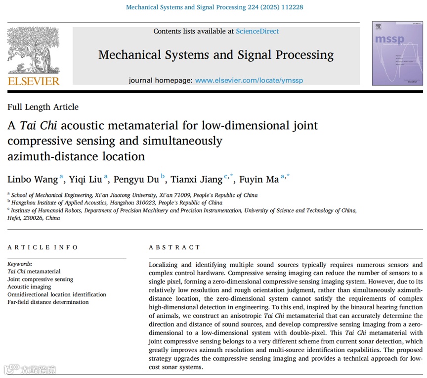 相关研究成果以“一种用于低维联合压缩传感和声源定位的太极声学超结构”(A Tai Chi acoustic metamaterial for low-dimensional joint compression sensing and source location)为题,在线发表在《Mechanical Systems and Signal Processing》[Mech. Syst. Signal Proc. 224, 112228, 2025]上。西安交通大学为第一作者单位,西安交通大学和中国科学技术大学为通讯单位,机械工程学院硕士生王林波为第一作者,马富银教授和姜添曦副研究员为共同通讯作者,机械工程学院硕士生刘一琪和杭州应用声学研究所高级工程师杜鹏宇对论文提供了重要贡献。