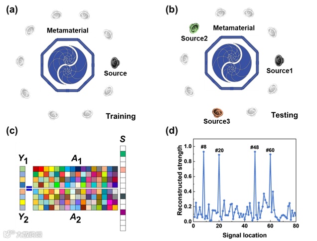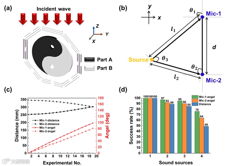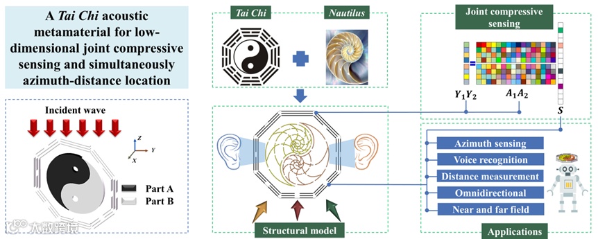 西安交通大学机械工程学院马富银教授课题组和中国科技大学精密机械与精密仪器系姜添曦副研究员合作,提出一种各向异性太极仿生超结构,可以同时确定声源方位和距离,将压缩感知成像从零维体系发展至低维体系。这种太极超结构同时利用了内部海螺仿生双阴阳鱼的各向异性、外围八卦的各向异性特征和双鱼眼间的联合观测矩阵,大幅提升了方位分辨率和多声源识别能力,同时具备了精确测距和位置定位能力。通过采用双传感器联合压缩感知方法,可以显著提高声源方位辨识的正确率、分辨率和数量。此外,他们还证实了通过利用双传感器进行独立方位辨识,可以有效地确定声源距离,从而克服空间采样定理和“锥面模糊”等缺陷。这种太极超结构定位装置不仅结构简单,而且能够有效地对多个宽带声源进行近场和远场全向方位定位以及距离确定。所提出的策略扩展了压缩感知声成像方法的应用领域,为新型低代价声呐系统开发提供了技术途径。