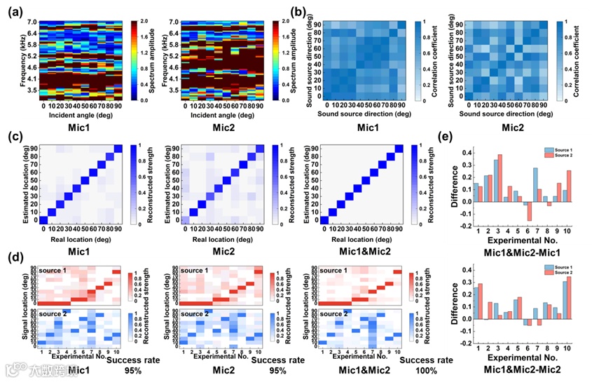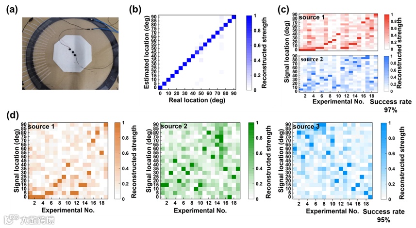 论文进一步进行了5°分辨率多声源定位与辨识实验,实验方法和结果如图5所示。可以看到,20根波导管被每隔5°布置在超结构外侧,双传感器联合压缩感知成像方法用以测试5°分辨率下的多声源辨识性能。结果显示,其单声源估计位置与实际位置一致,双声源辨识成功率为97%,这表明基于仿生太极超结构的成像装置能够以更高分辨率实现单声源定位与双声源辨识。进一步,该成像装置可以辨识三声源位置和内容,辨识成功率为95%,四声源辨识成功率为80%。结果表明,基于仿生太极超结构的成像装置能够以5°分辨率识别声源位置并同时从多个混合信号中分离音频内容。总的来说,这种方法可以用于提高声成像装置的分辨率和识别率,提升声源辨识数量,具有广阔的应用前景。