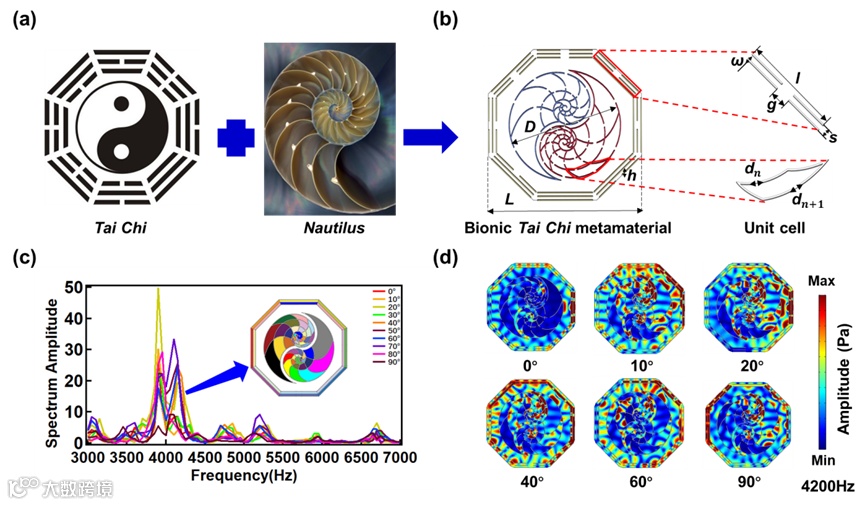 论文提出了一种太极声学超结构,如图2所示。由内外两部分组成,内部是由两个仿生鹦鹉螺超结构组合构成的圆形太极结构,外部是由八个经卦组成的八边形折叠结构,内外部结构的结合使得超结构同时具有空间折叠和螺旋渐变特性。每个声学通道包含外部两层折叠通道和内部两层或三层螺旋空腔。外部单层折叠通道和内部单个腔室各对应一个声学单元,声学单元的几何参数,包括折叠通道长度、空腔的体积和孔的位置分布等,将直接影响频率响应。具有不同几何参数的元胞组合构成具有不同传输特性的声学通道,不同传输特性的声学通道组合构成具有空间频率调制性能的超结构。不同方向入射的声波经过超结构调制后仍具有不同声压幅值,在各个频率处具有不同的声场分布,使得超结构具有对方向敏感的声学频率响应和较高分辨率。