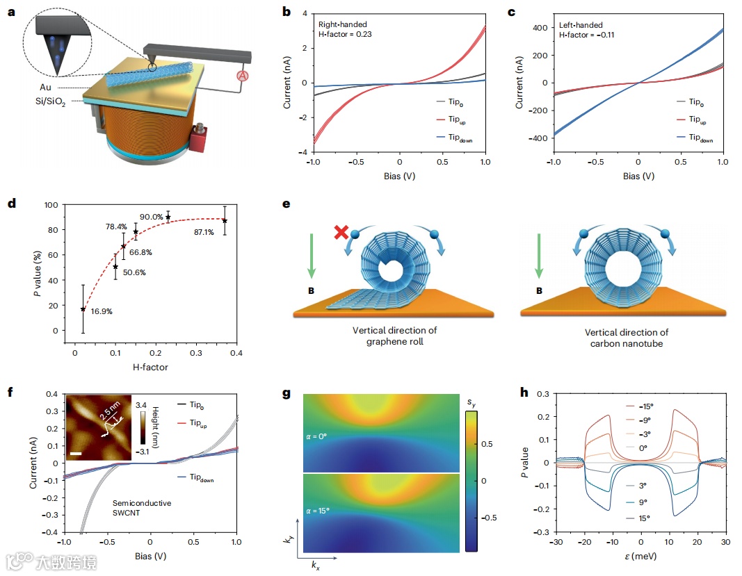 作者测量了不同磁化方向下不同手性卷的平均电流-电压(I-V)曲线(图4b-d),所有测量均在室温下进行。原位mCP-AFM测量的可靠性通过逐步扩增协议和统计平均方法来保证,以消除系统误差。对于右手卷,观察到当尖端在“上”方向磁化时,电流要比“下”方向磁化大得多(图4b)。对于左手卷,观察到相反的行为(图4c)。手性旋卷还允许研究手性H因子与自旋极化之间的依赖关系。研究发现,P与H因子的相关性逐渐增加并趋于饱和(图4d),并且不受偏置电压的明显影响。