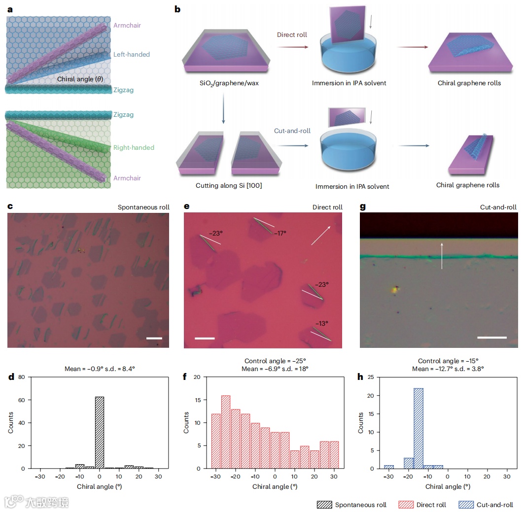 垂直浸入异丙醇中,控制角度为之字形边缘与溶液表面的交角。当石墨烯与热溶剂沿不同角度接触时,由于控制角度上的表面张力,石墨烯将定向卷起。在“切卷”过程中,使用连续的单晶石墨烯。首先沿着硅的[100]轴切割蜡/石墨烯/硅,以创建平坦的石墨烯手性边缘,其中手性角由石墨烯之字形边缘和硅[100]轴决定。当将样品沿边缘浸入热的异丙醇溶液中时,石墨烯精确地与硅[100]边缘平行卷动(图1g)。这种切卷法能够精确地调整石墨烯的手性角度(图1h)。然而,尽管卷动角度的可控性较低,但直接卷动方法具有成品率高的优点,并且可以从光学图像中确定每个卷动的精确卷动角度(图1e、f)。因此,后一种方法更适合于与卷角相关的光学和电子研究。