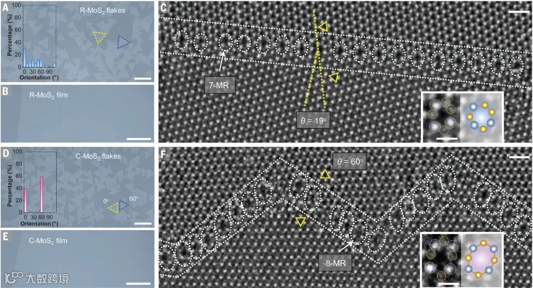 在此研究中,作者报道了定义明确的八元环(8-MR)孔,通常形成在两个反平行的单层二硫化钼(MoS₂)晶粒的边界上,可以作为有效的水-离子分离的分子筛。晶界密度和8-MR孔的数量可以通过调节晶粒尺寸来调节。优化后的MoS₂膜在正向渗透测试中表现出超高的水/氯化钠选择性和优异的透水性,优于最先进的膜。通过晶界工程在原子薄膜上制造精确的孔结构,为制备适合各种应用的薄膜提供了一条有前途的途径。