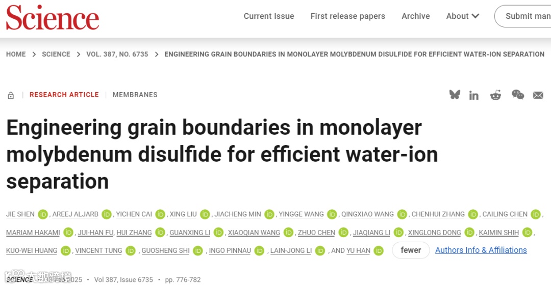Shen, J., Aljarb, A., Cai, Y. et al. Engineering grain boundaries in monolayer molybdenum disulfide for efficient water-ion separation. Science, 2025, 387, 776–782. https://doi.org/10.1126/science.ado7489