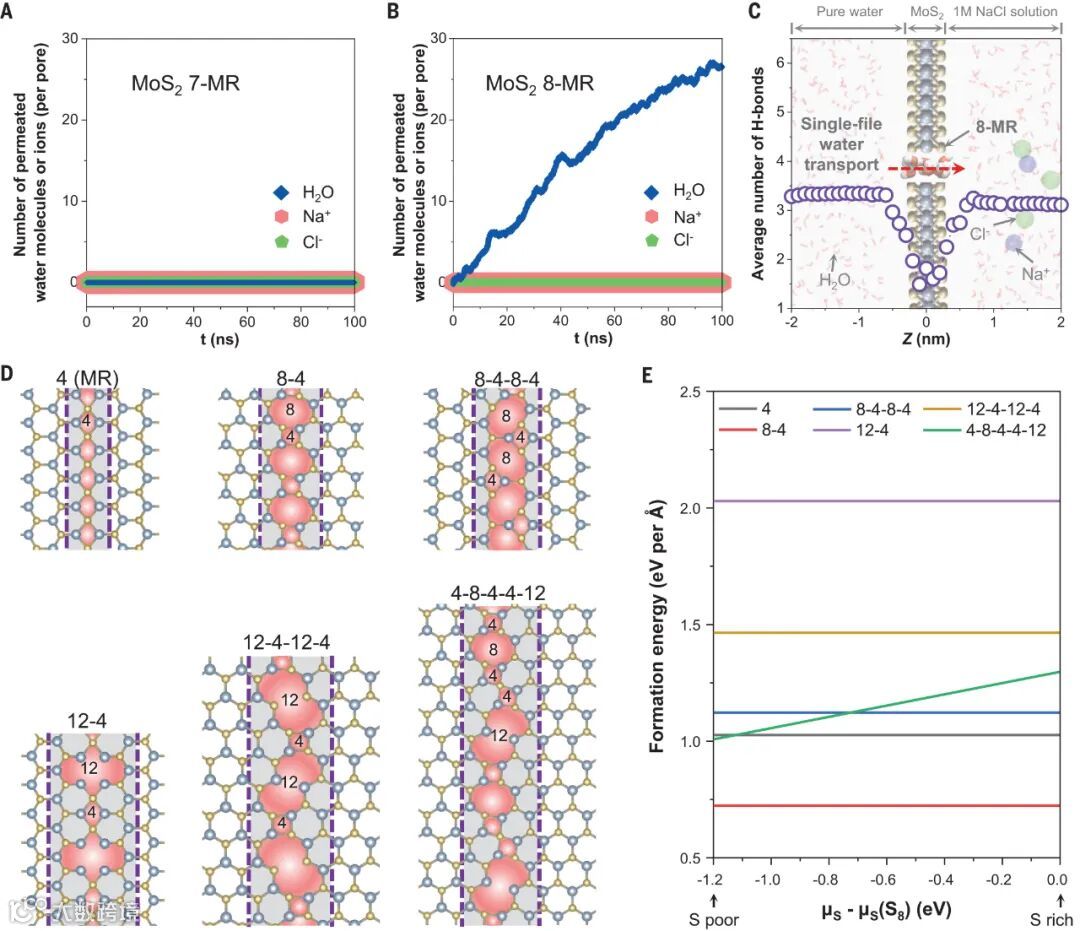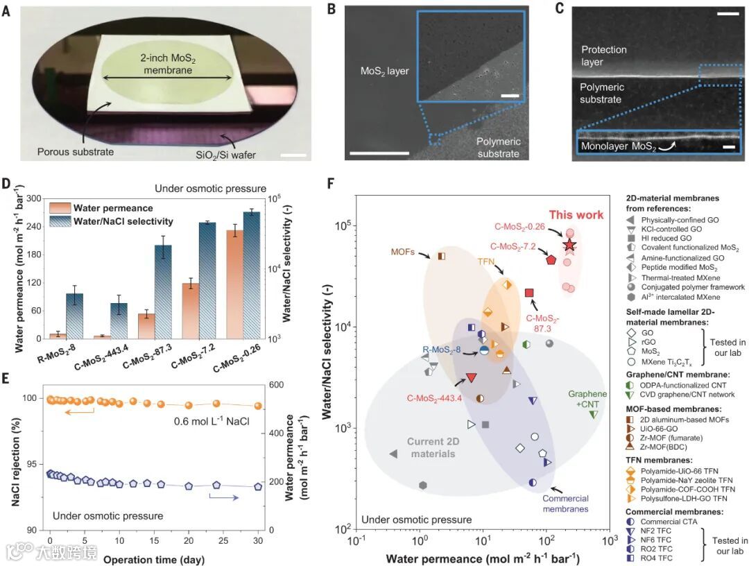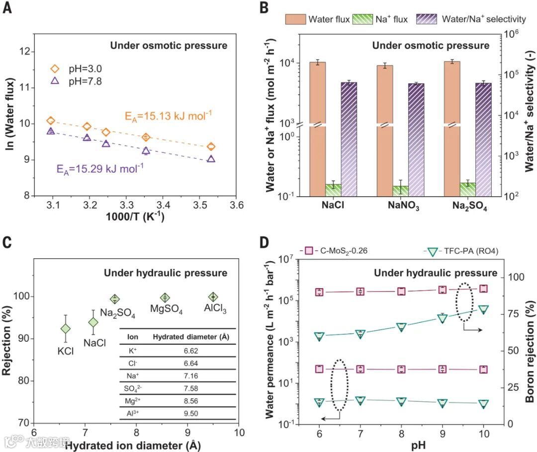 图3 | C-MoS₂膜的水-离子分离。