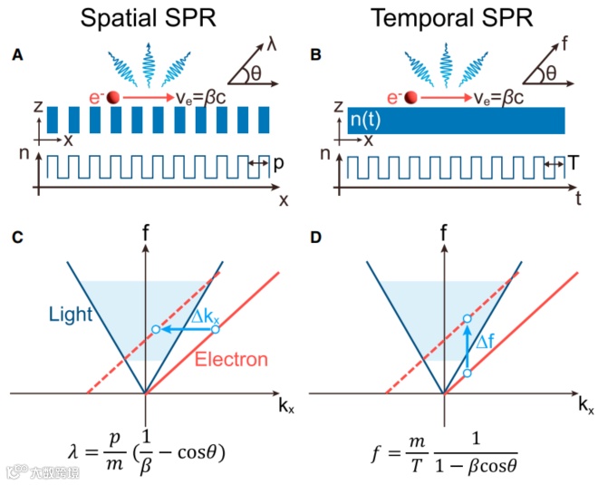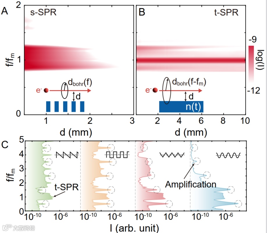 (2)有源可重构特性:与传统光栅不同,时间光栅提供了一种有源调控平台。通过调节时间光栅的调制周期、幅度和波形(见图3C),可以精确控制T-SPR的辐射频率、方向和强度,提供比传统SPR更大的灵活性。