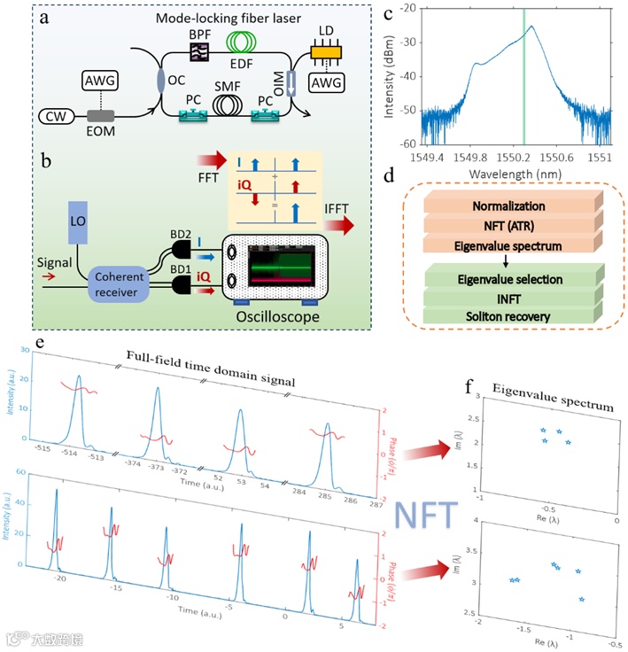 非线性傅里叶变换(NFT),作为适用于超快光学的先进处理方法,近年来引起了人们的广泛关注。NFT作为一个强大的数学工具,在逆散射变换方法的框架下发展起来,用于求解非线性可积系统中的波传播问题,这使得非线性薛定谔(Nonlinear Schrödinger, NLS)方程的著名孤子解得以深入研究。同时,在合适的归一化条件下,NFT可以用于表征耗散非线性系统的超快动力学,从而显著降低精确追踪脉冲动力学的实际自由度。进一步地,在实际的超快激光实验中,测试NFT表征孤子动力学的泛化能力是非常必要的,因为大量孤子模式的存在可能对NFT的检索精度构成显著挑战。