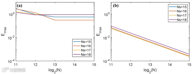 图3. 使用(a) 软件库FNFT和(b) ATR-NFT方法对特征值数Ns和时域样本数N的最大误差(Emax)估计。