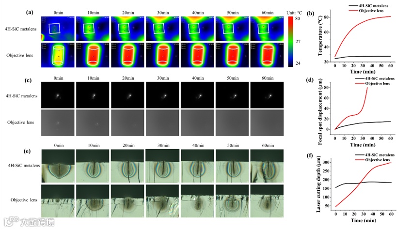 为了模拟激光加工中严苛的高功率连续加工条件,在热漂移测试中采用了与光学测试相同的光路,但光源替换为 15 W 1030 nm 激光器。分别测试了 4H-SiC 超透镜和商用物镜在连续工作 1 小时内的器件温度、焦平面和切割效果的变化。通过红外热成像仪测得的器件表面温度变化如图4a-b 所示。在高功率激光照射 60 分钟后,4H-SiC 超透镜的器件温度仅上升了 3.2℃,温度变化仅为物镜(升温 54.0℃)的 6%。与传统物镜相比,4H-SiC 超透镜在没有附加冷却组件的情况下,运行约 10 分钟后即可达到稳定温度,且温度变化较小、工作温度更低。这种卓越的热管理性能展现了 4H-SiC 超透镜在苛刻工况下的有效性。
