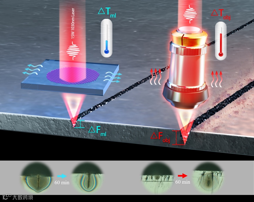图1:4H-SiC超透镜(左)与传统物镜(右)的热漂移效应示意图。