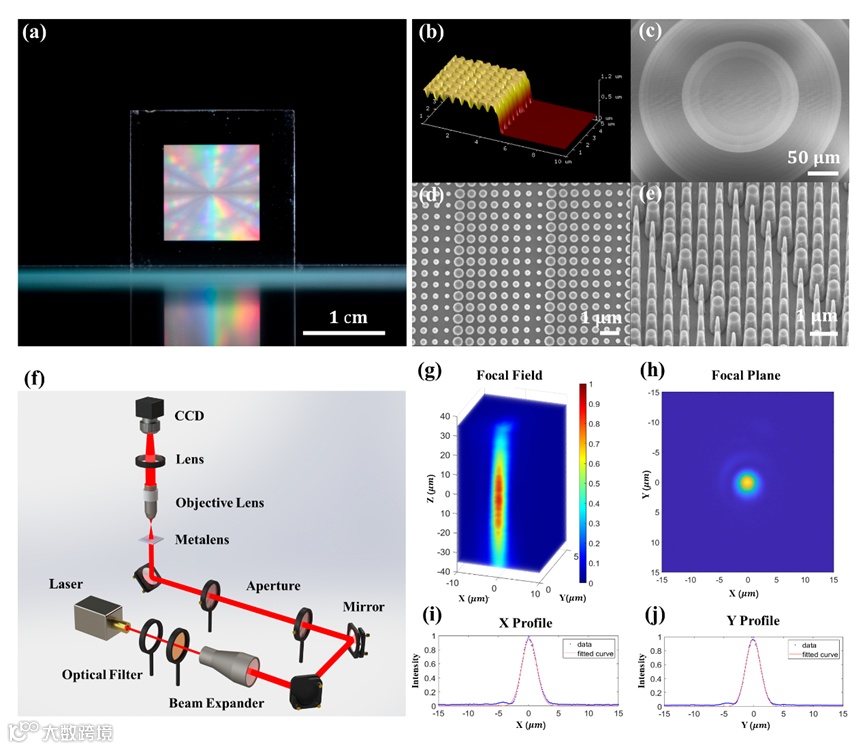 图3:4H-SiC超透镜形貌表征与光学测试