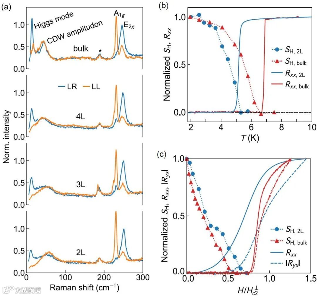 团队进一步利用拉曼光谱技术深入研究了该体系的超导希格斯模(图2)。希格斯模是一种源自超导序参量幅值涨落的集体激发模式,可通过与电荷密度波振幅模的耦合而被赋予拉曼活性,是超导性质的灵敏探针。实验首次确立了原子薄层
