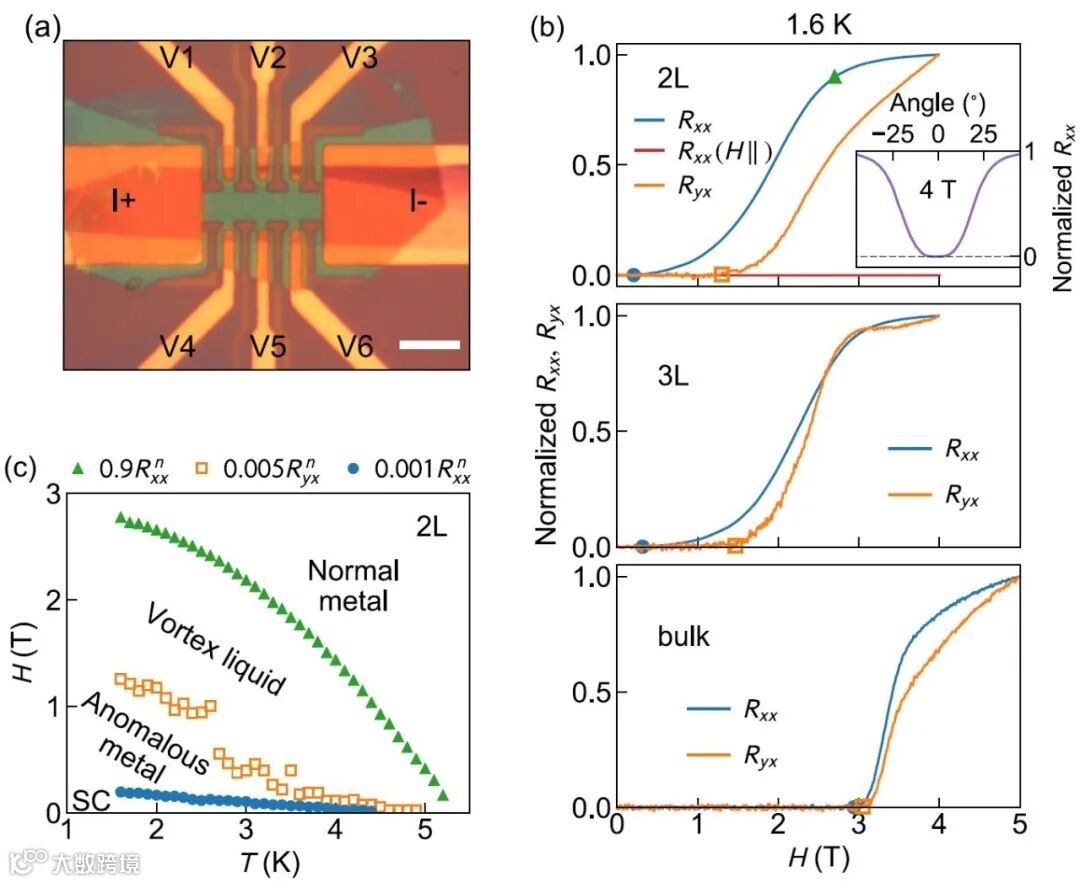 图1:(a)典型器件照片。(b) 不同厚度样品纵向与霍尔电阻的磁场依赖。(c) 双层样品的磁场-温度相图。