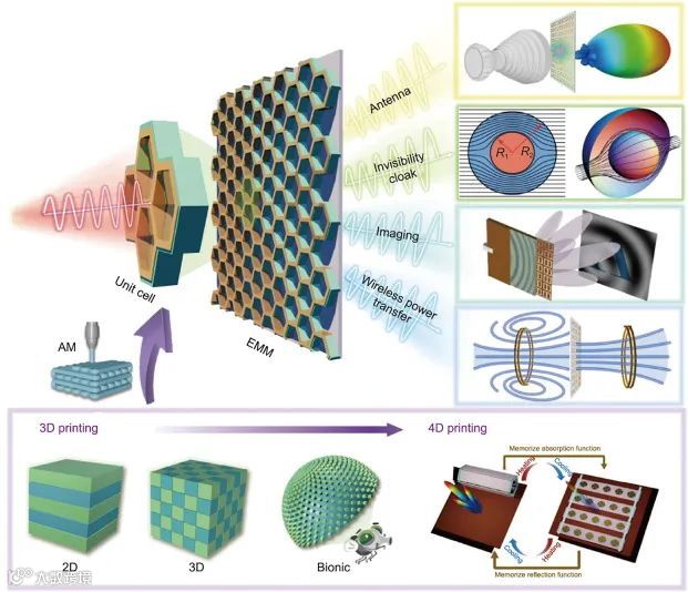 3D打印是制造具有不同几何参数及相关性能的电磁超材料器件最有效的技术,但传统的3D打印电磁超材料器件可能缺乏制造灵活性以及对不同物理刺激(如电场和磁场)的环境适应性。4D打印则是一种理想的技术,适用于将结构设计与能对外部场环境做出自适应的智能材料相整合的方案,例如,打印出的部件可在电刺激下改变形状。