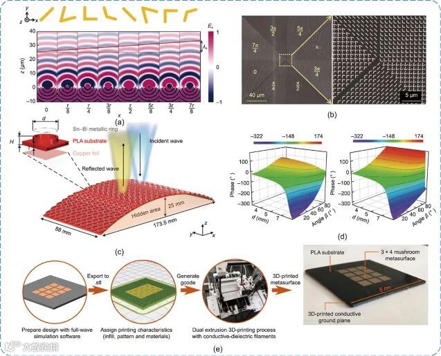 图4. 一些电磁超表面。(a,b)基于反射和折射广义定律的超表面。(a)等离子界面的单元格示意图,以展示反射和折射的广义定律。(b)产生光学涡旋的等离子界面的扫描电子显微镜(SEM)图像。(c,d)拱形超表面地毯斗篷示意图和易弯曲单元格的电磁特性。(e)蘑菇状超表面的3D打印过程:从设计到施工。