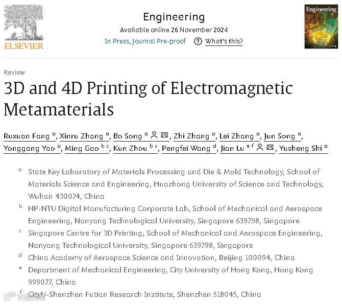 相关成果以「3D and 4D Printing of Electromagnetic Metamaterials」为题刊登在中国工程院院刊Engineering上。