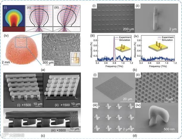 图6. 3D微/纳米EMM。(a)3D THz GRIN透镜。(b)制造的垂直SRR(VSRR)超材料的SEM图像和太赫兹时域光谱测量结果。(c)正在考虑的3D SCR超材料。(d)扭曲ω粒子的介电模板。