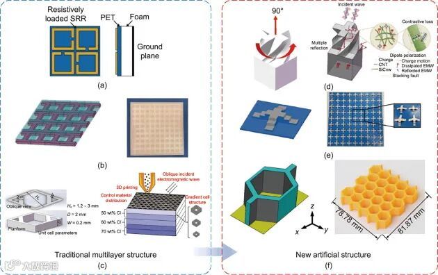 图5. 3D EMM的进展。(a)电阻油墨印刷吸收器几何形状。(b)EMM吸收器和制造样品的示意图。(c)单元电池和制造技术的示意图。(d)具有扭曲十字超材料结构的Al₂O₃/碳纳米管(CNT)/碳氧化硅复合材料的电磁波吸收机制示意图。(e)微型超材料吸收器,与3D打印的楼梯状耶路撒冷十字架一起使用。(f)3D EMM的单元单元图和样本。