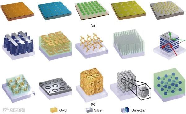 图3. 多样的EMM结构。(a)2D EMM结构包括:圆形、V形、交叉表面贴片和嵌入式圆柱体。(b)3D EMM结构包括:双渔网、立体声、手性、双曲、金属介质层状、裂环谐振器(SRRs)、同轴、连接立方对称、金属团簇和简单立方结构。
