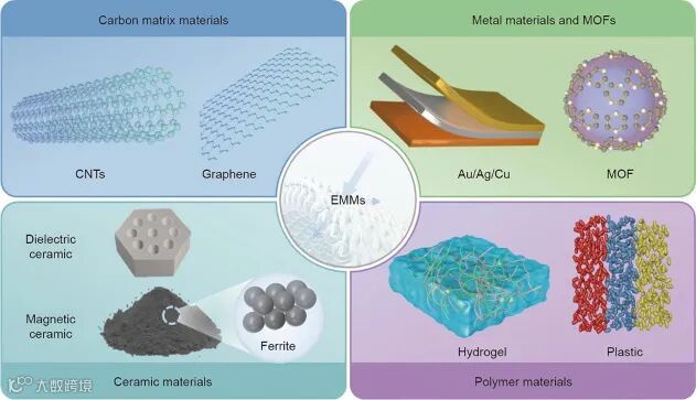 图2. 一些常见的电磁材料包括:碳基材料、金属材料和MOFs、陶瓷材料和高分子材料。